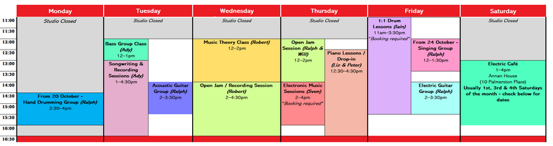 Our current timetable can be seen below, with the names of volunteers running the sessions (you can click on the image to expand it). As our members and volunteers experience a wide range of challenges, we take a flexible approach to scheduling, so please note that the timetable may change at times; we will do our best to update this page and our Facebook page with the latest information. Our planned closure dates can be seen below.